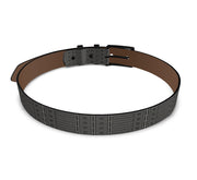 Handmade from Nappa leather adorned with gunmetal buckle. Brand mark with geometric pattern.