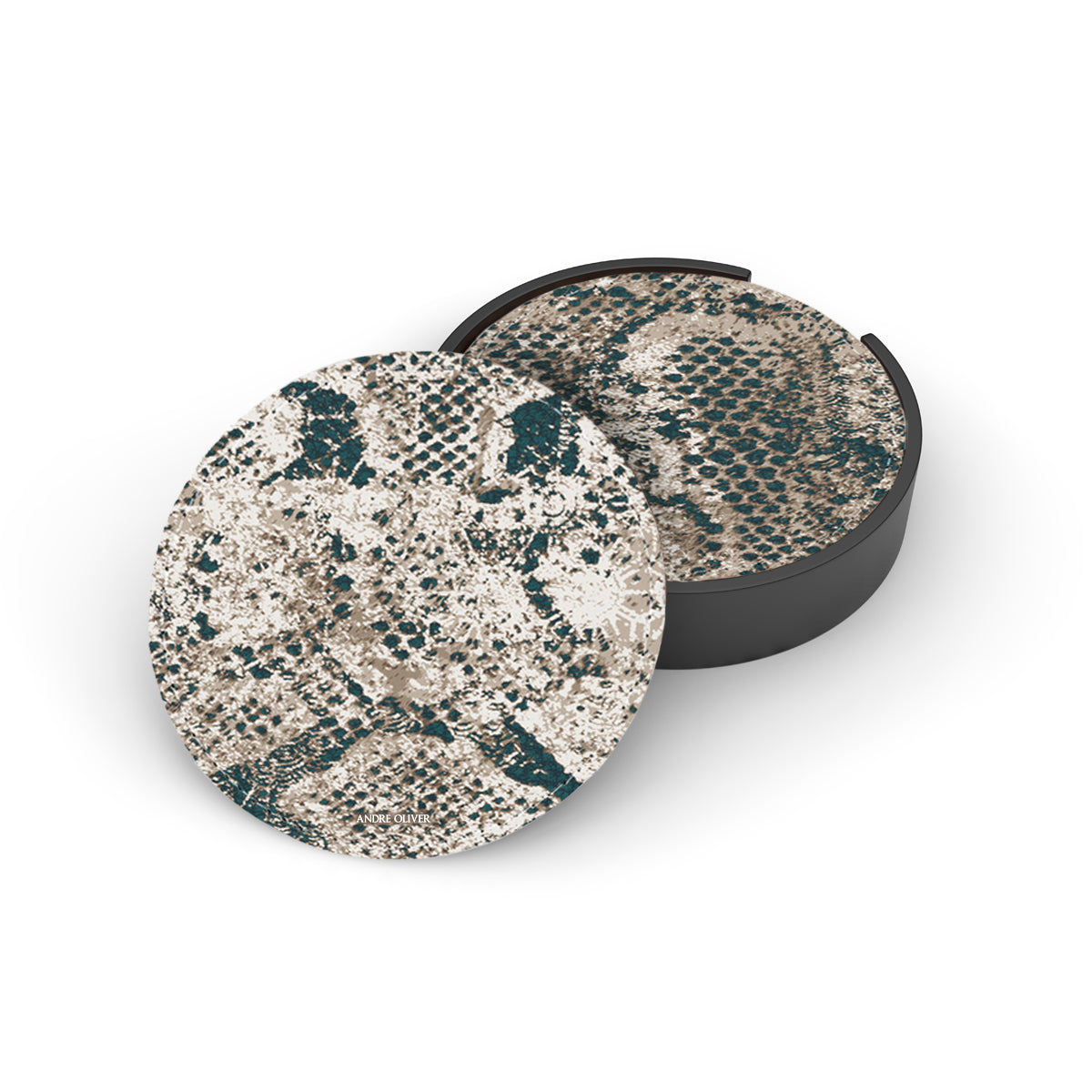 This Snakeskin Animal Print Coaster set includes 4 coasters. Vegan leather and hand-stitched, each coaster has a slightly different design.