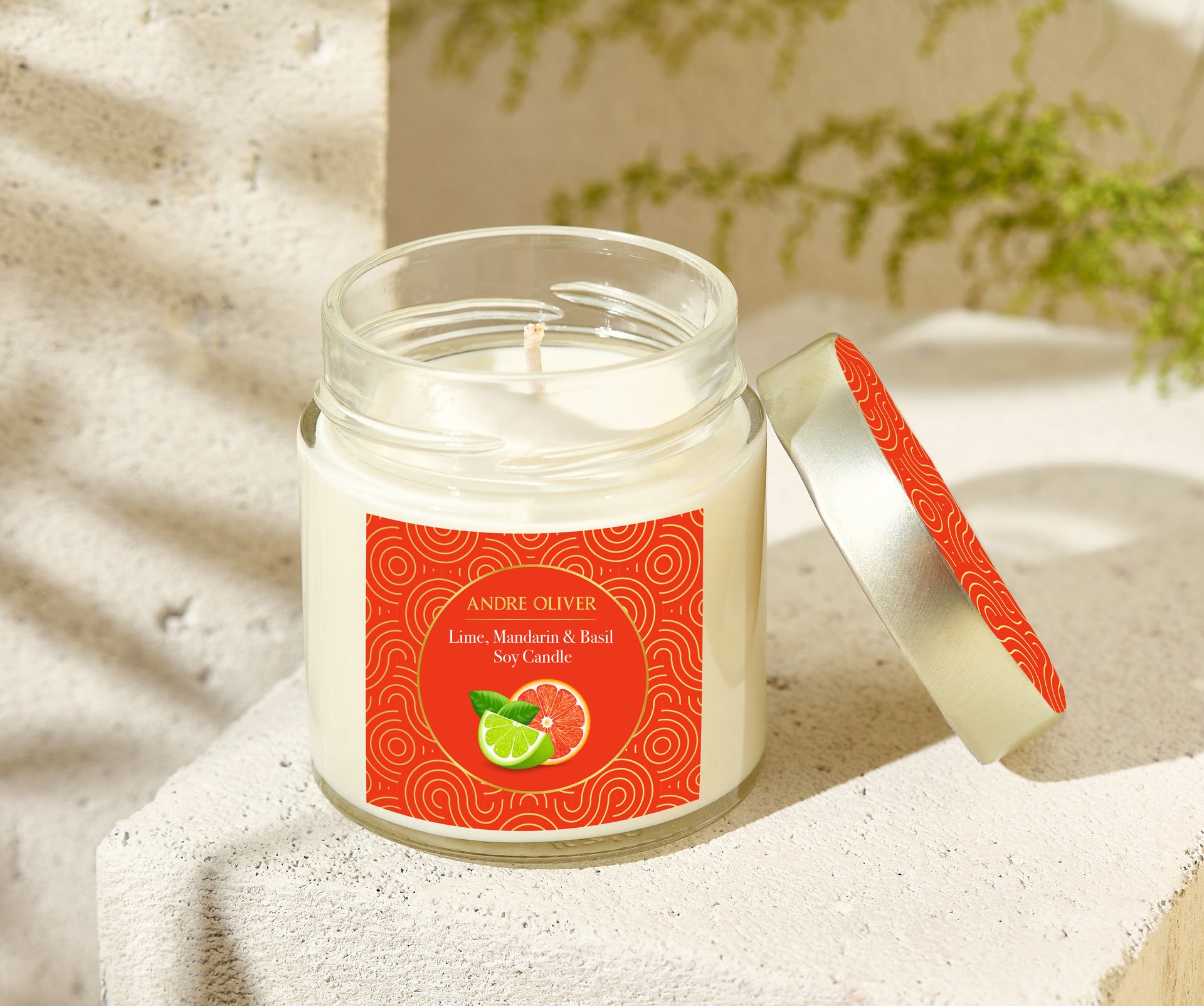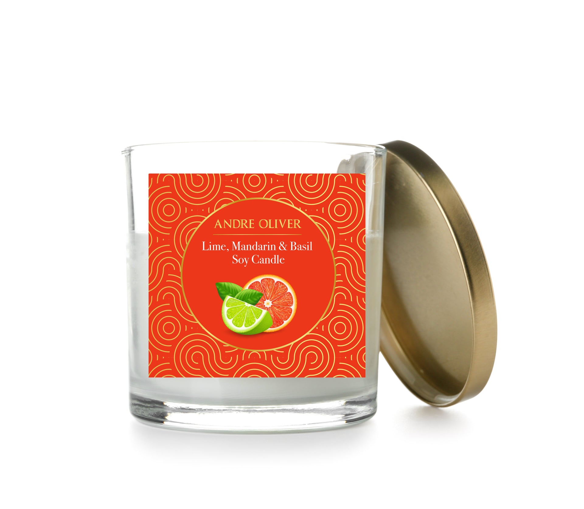 Hand-poured 100% vegan candle in recycled glass container. Made from all natural ingredients and cotton wick. Notes of lime, mandarin, basil and tangerine. Each candle is handmade per order. 50 hour burn time.