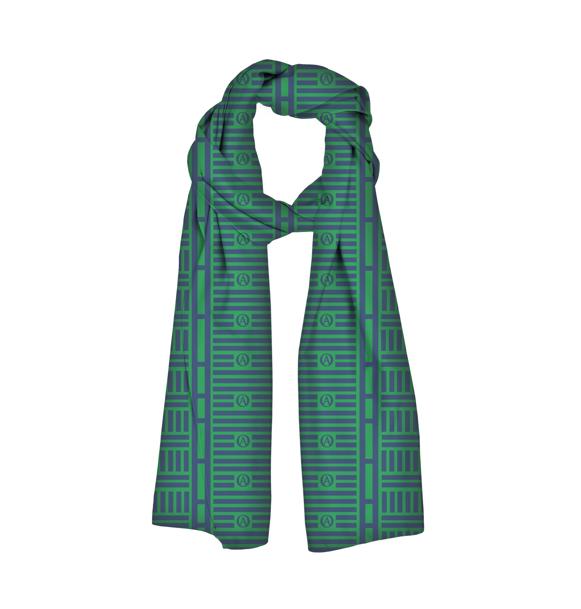 The Olivia square silk scarf measures 45" x 45" (115 cm). Brand mark with geometric pattern. Baby hem stitching. Includes satin dust bag. Available in Green, Black or Red.